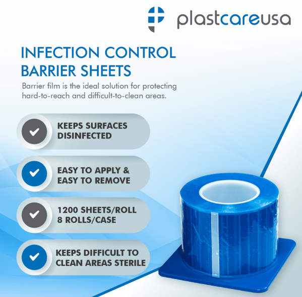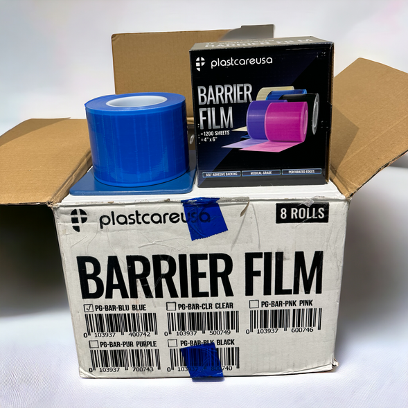 Plastcare USA Barrier Film Roll is medical-grade plastic wrap, equipped with a self-adhesive backing. Essential for maintaining a hygienic environment, this heavy-duty, disposable barrier film simplifies the cleaning process between patients or at the day's end. Individually boxed with perforated 4” x 6” sheets for easy use. Barrier film roll can be molded into various shape accommodate instruments and equipment such as water syringe handles, hoses, door handles, and more. barrier film ensures your office meets the highest standards of disinfection. Providing better overall protection and durability, our barrier film is 6.5 nanometres thick while the industrial grade average is 4-5 nm.