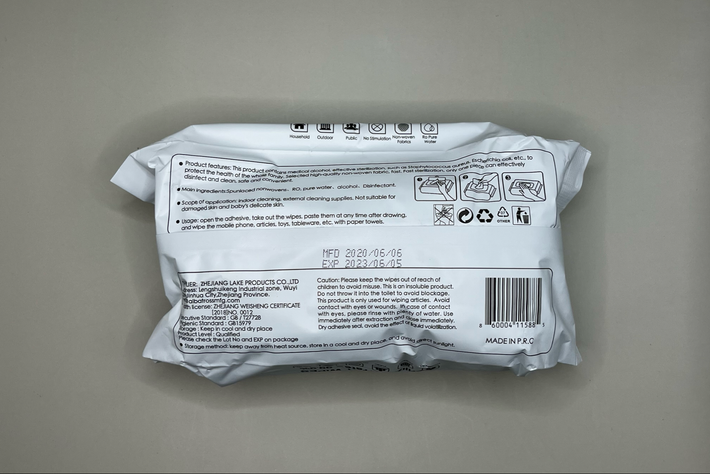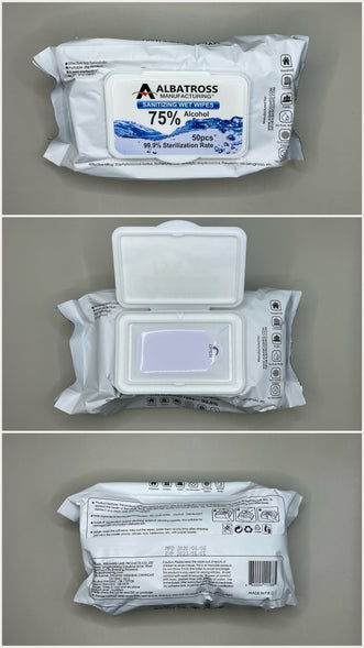 Albatross 75% Alcohol Sanitizing Wet Wipes are manufactured by Zhejiang Lake Products Co., LTD located in Zhejiang, China. Distribution company is C. Joel Enterprise Inc., Riverside, CA., USA.