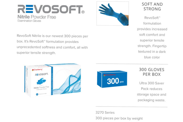Cranberry RevoSoft® Nitrile Powder-Free Exam Gloves are formulated to provide unprecedented softness and comfort, all with superior tensile strength. Made in Malaysia, nitrile gloves manufactured in this region are known to be the highest quality as it is the origin of nitrile raw materials. This new revolutionary nitrile allows for the most comfortable fit with minimal hand fatigue. Revosoft’s average glove thickness of 2.8 mil allows for enhanced fingertip texture, superior handling, and increased control.