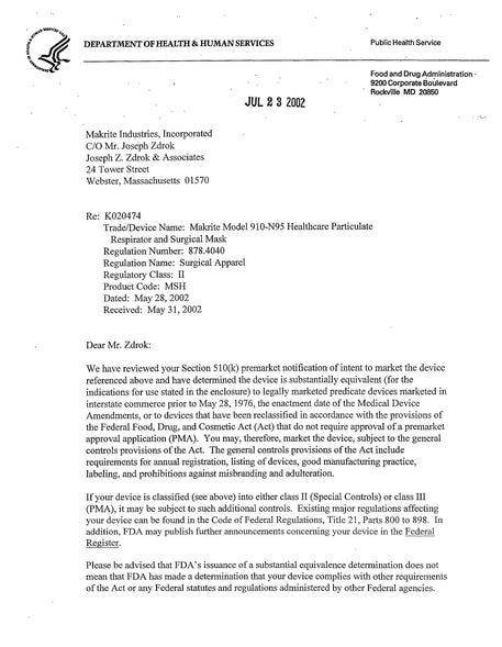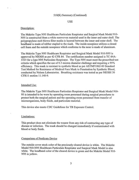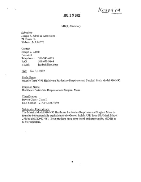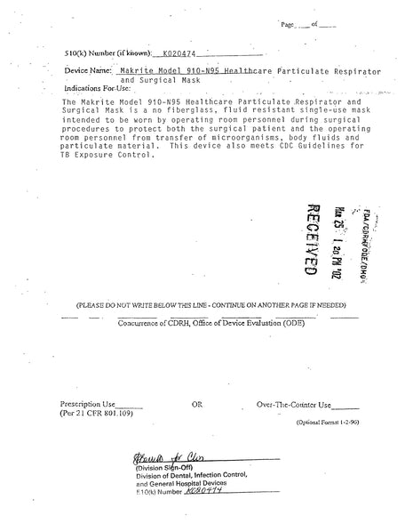 Makrite 910-N95 FMX FDA 510k K020474 Premarket Notification click for more information