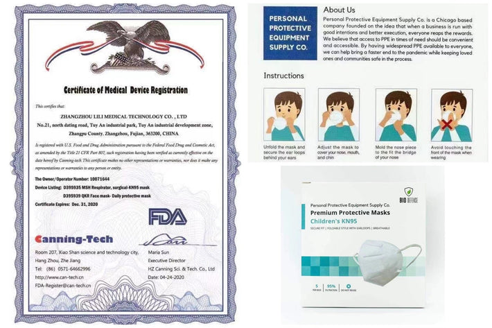 Bio Defense Premium Children’s KN95 masks are manufactured by Zhangzhou Lili Medical Technology Co. Ltd. located in Zhangzhou, China. The brand owner is Personal Protective Equipment Supply Co. located in Chicago, USA.