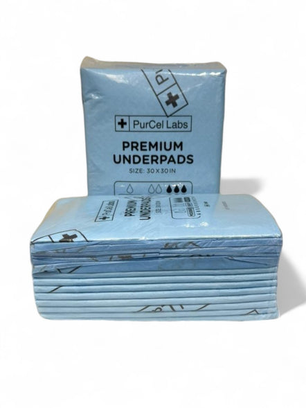 PurCel Labs Premium Underpads offer superior protection and comfort with maximum absorbency. Measuring 30" x 30", these underpads feature a high-quality SAP core that quickly locks in moisture, while the advanced diamond structure enhances liquid distribution for better absorption. The fluff core is designed with odor-control technology, helping to neutralize smells, and the soft, heat-sealed edges ensure gentle contact with the skin. Ideal for medical, personal, or pet use, these pads are a reliable choice for maintaining hygiene and comfort in any setting.