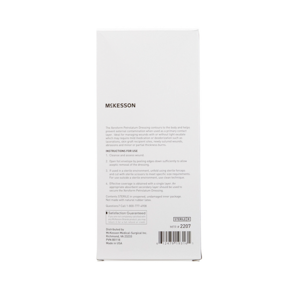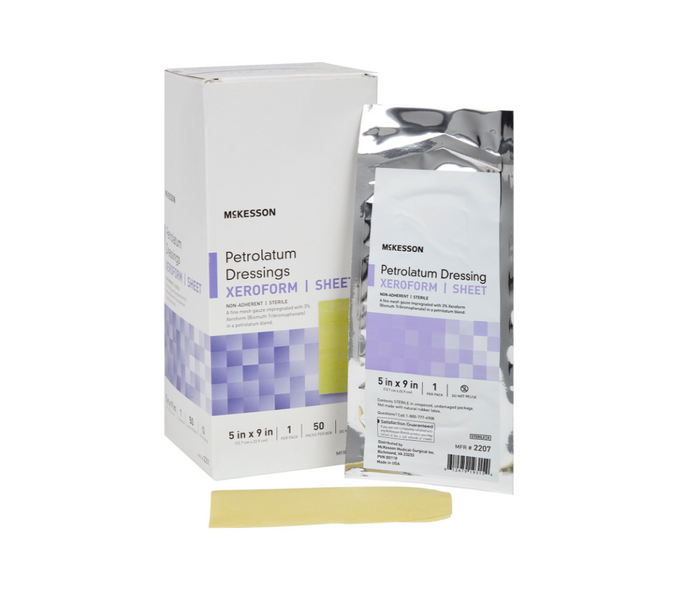 McKesson Xeroform Petrolatum Dressing is a sterile primary dressing designed for use on wounds with light or no exudate. The dressing contains 3% Bismuth Tribromophenate which provides bacteriostatic properties and helps to reduce the risk of infection and deodorize the wound. The dressing helps to maintain a moist wound healing environment, promoting autolytic debridement.